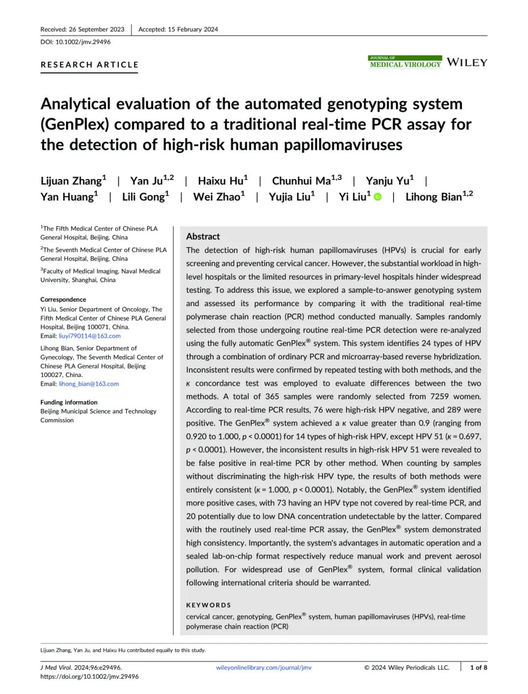 近日,中國人民解放軍總醫(yī)院第五醫(yī)學中心劉毅教授團隊在《Journal of Medical Virology》(影響因子=12.7)發(fā)布了一項關(guān)于高危HPV檢測的重要研究成果,題目為“Analytical evaluation of the automated genotyping system (GenPlex) compared to a traditional real‐time PCR assay for the detection of high‐risk human papillomaviruse”。(全自動基因分型檢測系統(tǒng)(GenPlex)與傳統(tǒng)實時熒光PCR方法用于檢測高危型人乳頭瘤病毒的分析評估)。